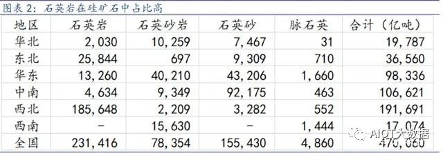 工业硅的上游原料是硅矿石,自然界的石英岩、石英砂、石英砂岩、脉石英等硅质原料统称 为硅矿石,生产工业硅的原材料主要是石英岩。从中国硅矿石资源类型看,石英岩查明资源储量 23.1 亿吨,占比 49%,主要分布在青海和陕西;石英砂储量 15.5 亿吨,占比 33%;石英砂岩储 量 7.8 亿吨,占比 17%;脉石英储量 0.5 亿吨,占比 1%。